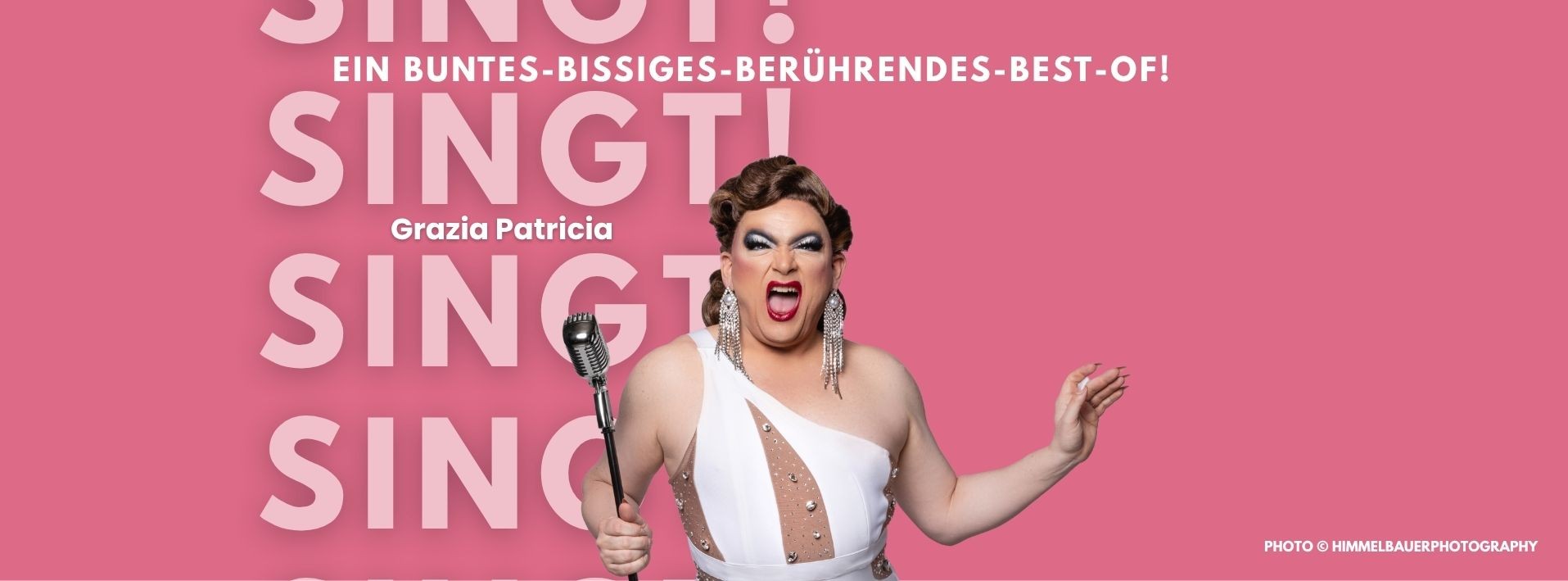 Mit frechem Augenzwinkern, schillernder Diva-Attitüde und einer Prise gepflegtem Wahnsinn entführt sie Grazia in ihre eigene Welt. In diesem „Best-Of“ ihrer Soloprogramme wird die Bühne zum Spielplatz der humorvollen Klassiker und großer Emotionen. Lassen Sie sich verführen, überraschen, aufrütteln – und vor allem: lachen Sie. Denn so charmant hat Ihnen schon lange niemand die Wahrheit ins Ohr gesungen. „Singt!“ ist ein Abend wie Champagner mit Pfeffer: prickelnd, poetisch und persönlich.