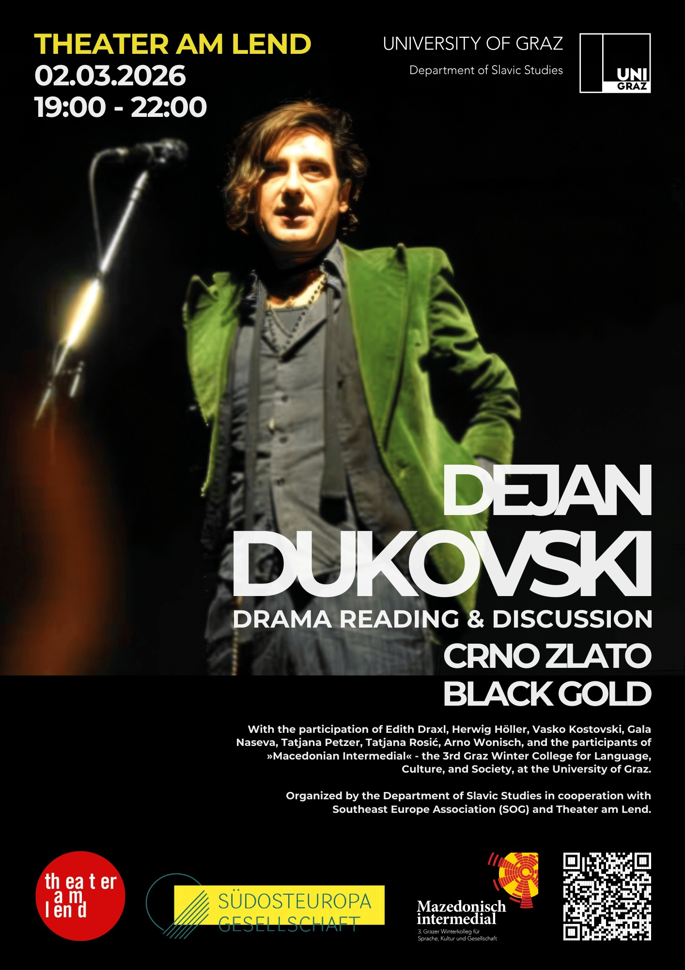 Ein zentraler Höhepunkt des Programms ist die szenische Lesung von Dukovskis neuestem Stück Crno Zlato (Black Gold), präsentiert auf Englisch und Mazedonisch. Crno Zlato erzählt die Geschichte einer trans Frau, die in ihre Heimatstadt zurückkehrt, sich ihrer Familie stellt und Erinnerungen an ihr früheres Leben im kleinen Balkanstaat Nordmazedonien durchlebt. Auf die Lesung folgt eine Podiumsdiskussion über die gesellschaftliche Wirkung zeitgenössischer Dramatik mit Dejan Dukovski, Vertreter:innen des Theater am Lend sowie Theaterwissenschaftler:innen, Künstler:innen und Forscher:innen aus Skopje, Belgrad und Graz. Die Diskussion wird von Prof. Tatjana Petzer (Institut für Slawistik, Universität Graz) moderiert.